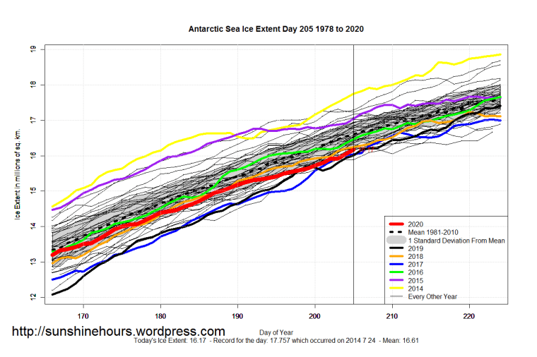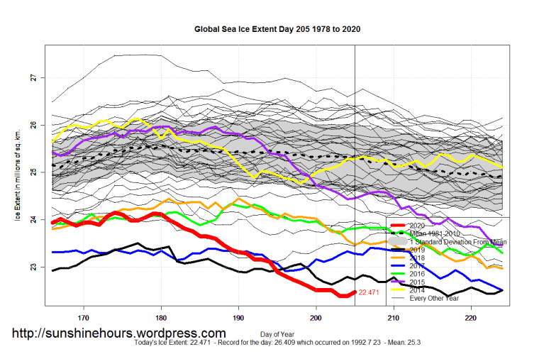 Sea Ice Extent (Global Antarctic and Arctic) – Day 205 – 2020 Published on July 24, 2020July 24, 2020 by sunshinehours14 Comments South / North
