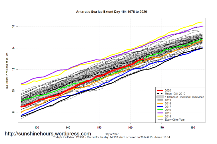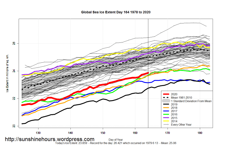 Sea Ice Extent (Global Antarctic and Arctic) – Day 164 – 2020 Published on June 13, 2020June 13, 2020 by sunshinehours11 Comment South / North