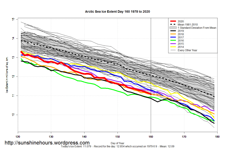 Sea Ice Extent (Global Antarctic and Arctic) – Day 160 – 2020 Published on June 9, 2020June 9, 2020 by sunshinehours11 Comment South / North