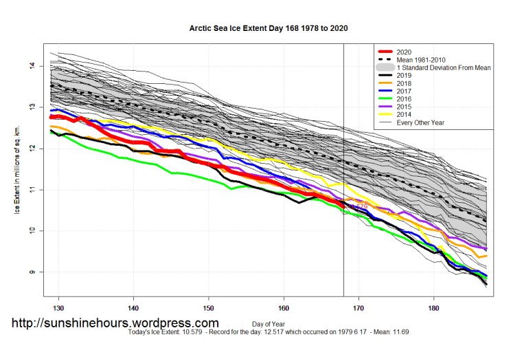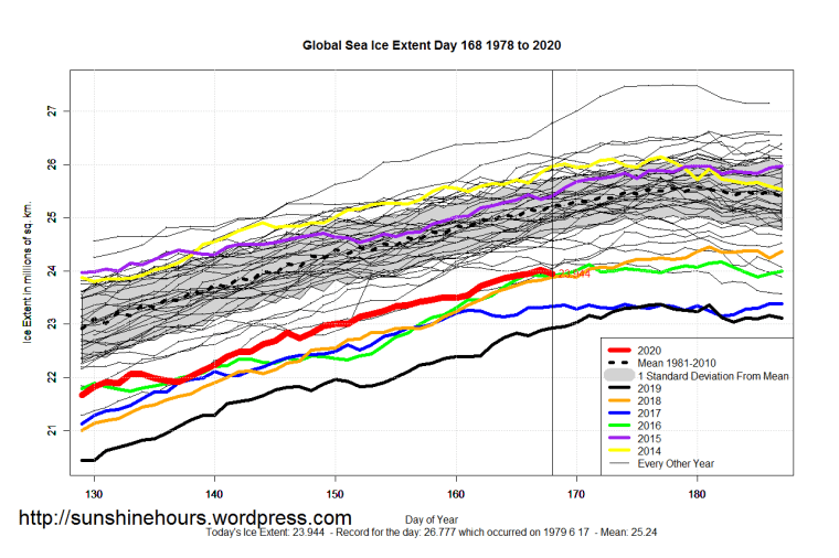 Sea Ice Extent (Global Antarctic and Arctic) – Day 170 – 2020 Published on June 19, 2020June 19, 2020 by sunshinehours11 Comment South / North
