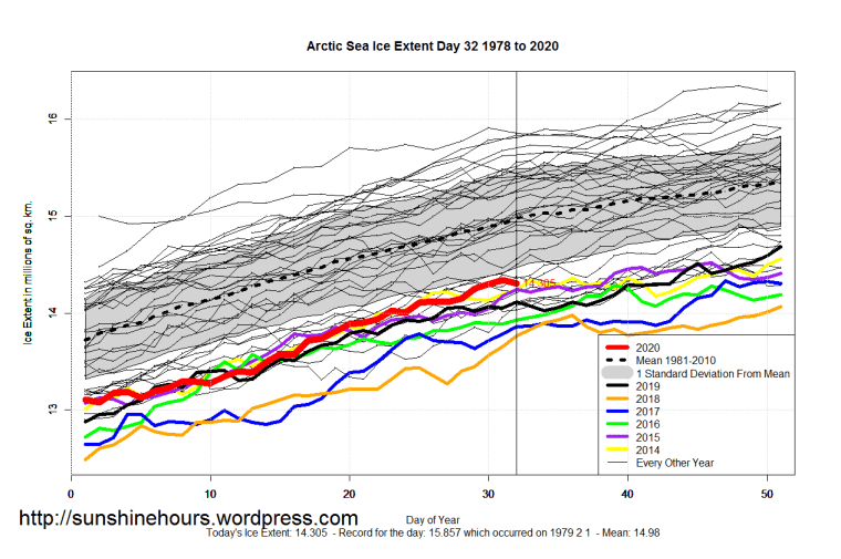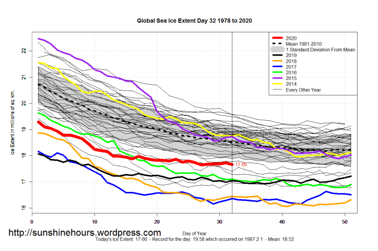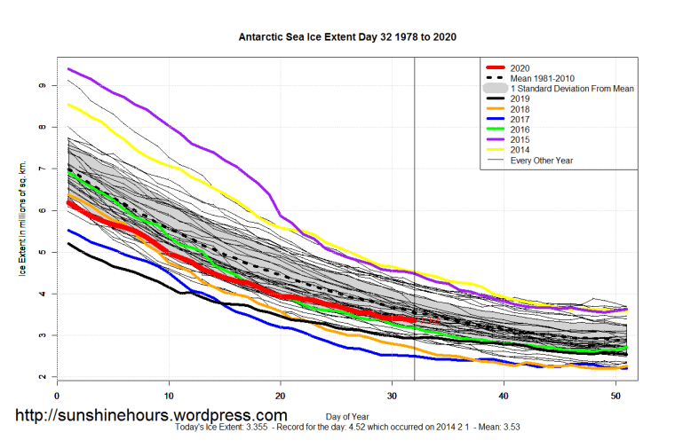 Sea Ice Extent (Global Antarctic and Arctic) – Day 32 – 2020 Published on February 2, 2020February 2, 2020 by sunshinehours12 Comments South / North