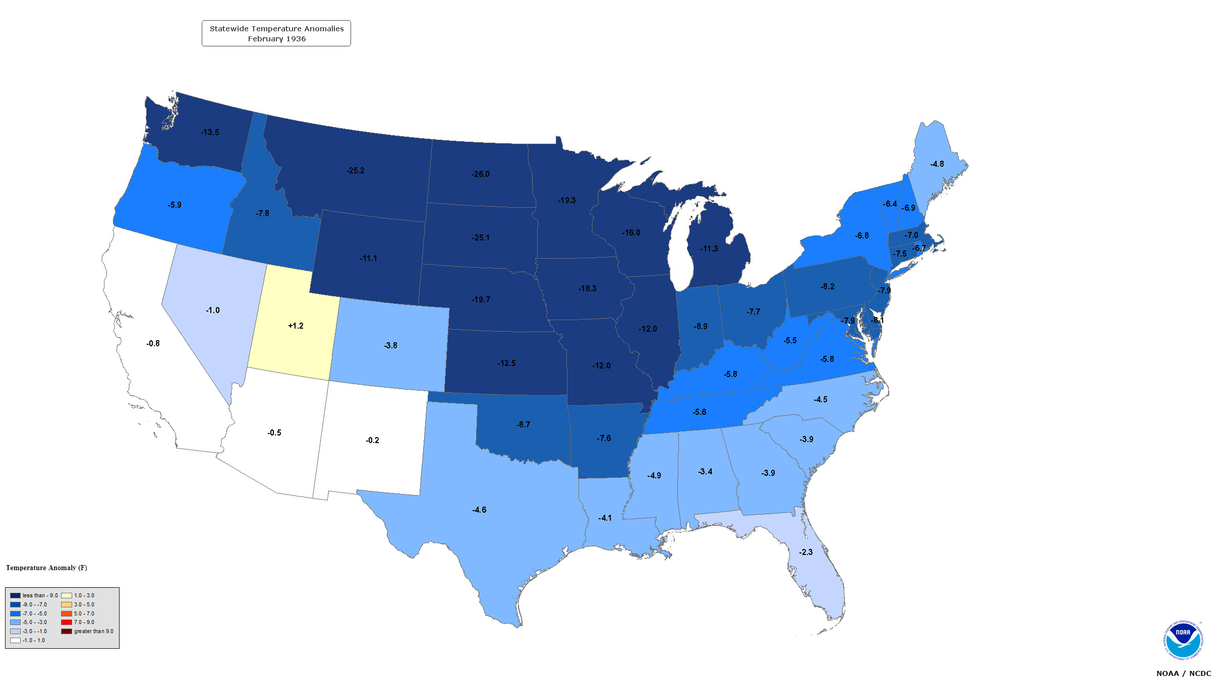 In North Dakota, February 1936 was –26.0°F below the 1901-2000 average. The whole month averaged -14.1°F below 0.