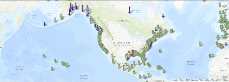 The map of relative sea level trends provides an overview of variations in the rates of local sea level change at long-term tide stations (based on a minimum of 30 years of data in order to account for long-term sea level variations and reduce errors in computing sea level trends based on monthly mean sea level).