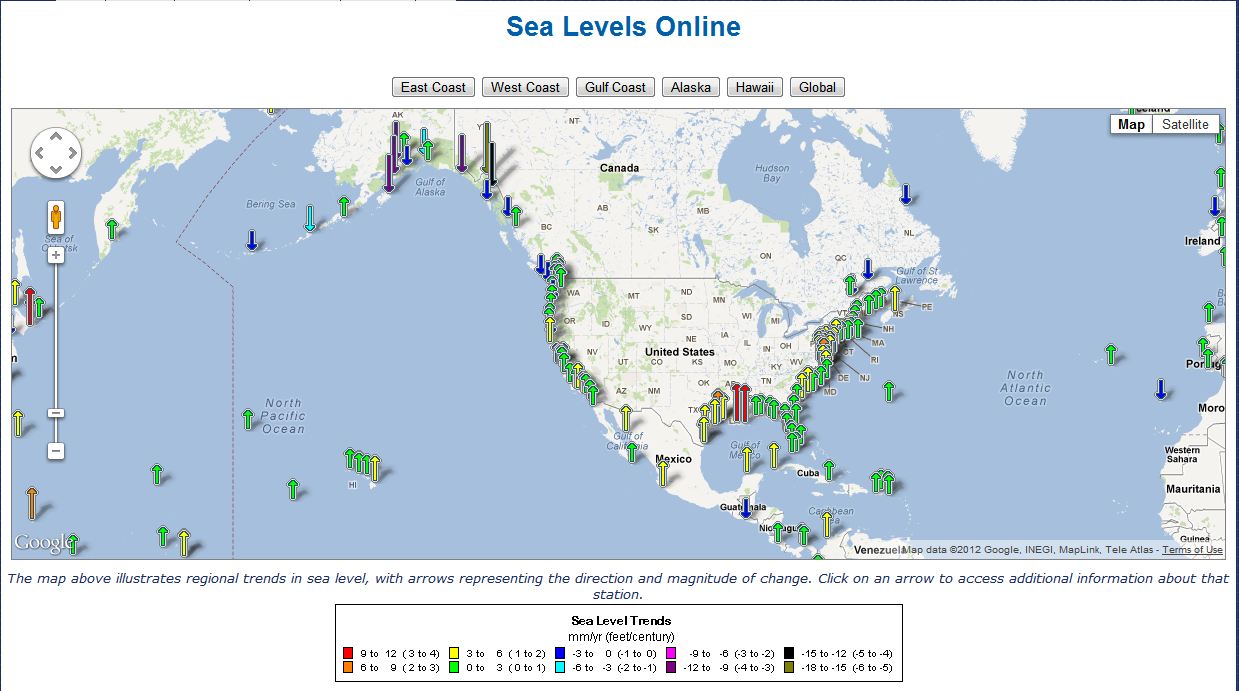 Stations illustrated with positive sea level trends (yellow-to-red) are experiencing both global sea level rise, and lowering or sinking of the local land, causing an apparently exaggerated rate of relative sea level rise.