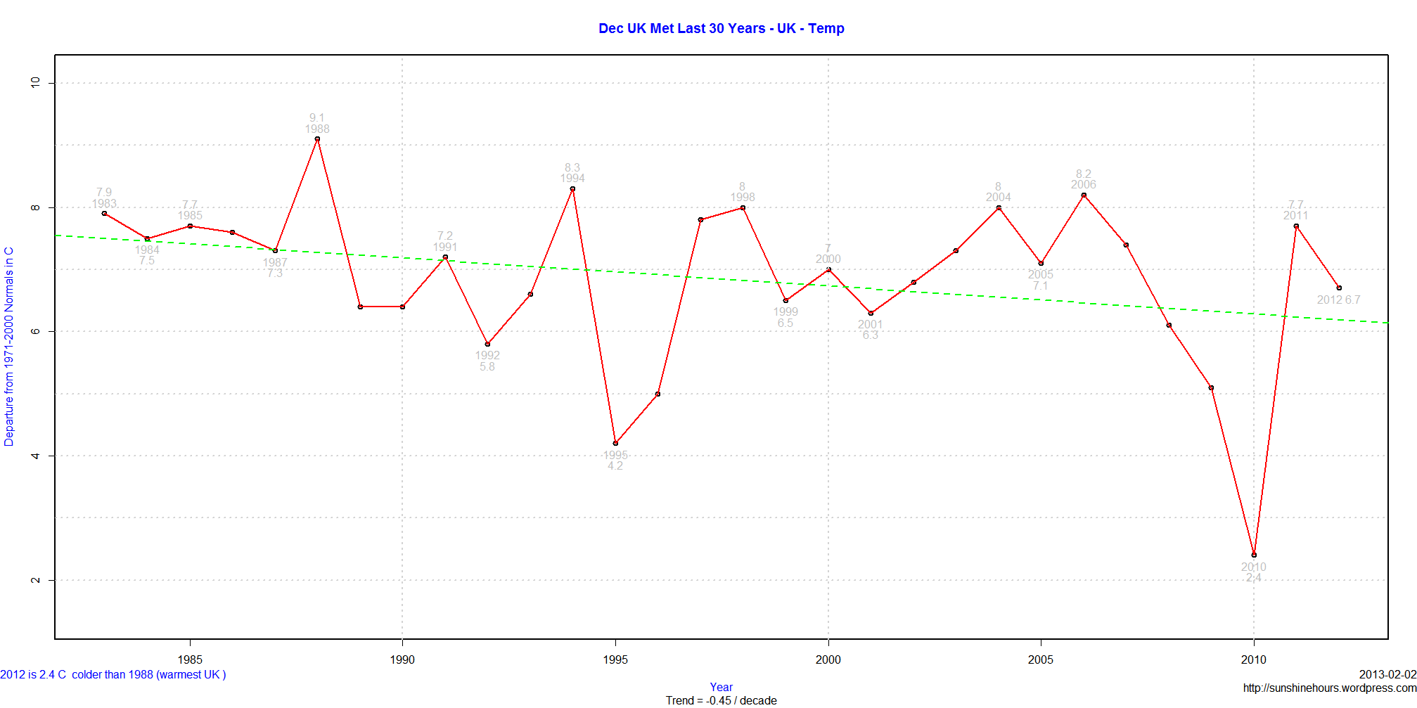 Using UK Met data from here, I noticed that Tmax for Decembers are cooling at -.45C / decade for 30 years. Thats a lot!