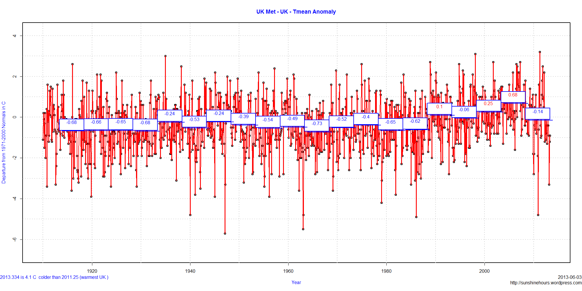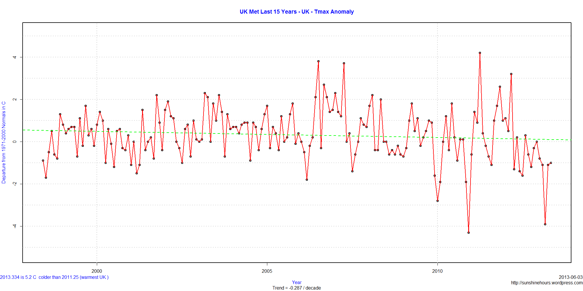 Using data from the UK Met, May Tmax (mean maximum temperature) in the UK is cooling at -.618C / decade for 15 years.