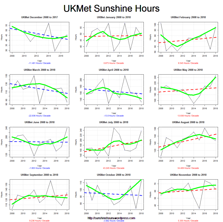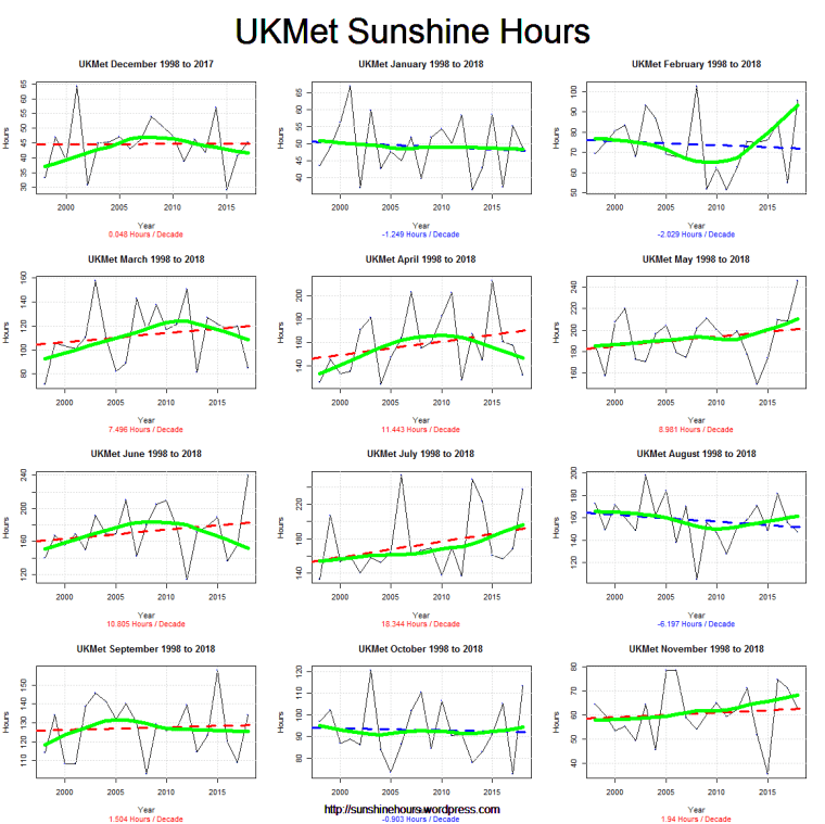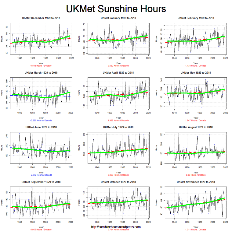 Guess what. Sunshine is up an average of 5.5 hours per year in December for the last 30 years. And compared to 1988 sunshine is up 80% in December. Instead of 28 hours of sunshine in December, the average is closer to 48.