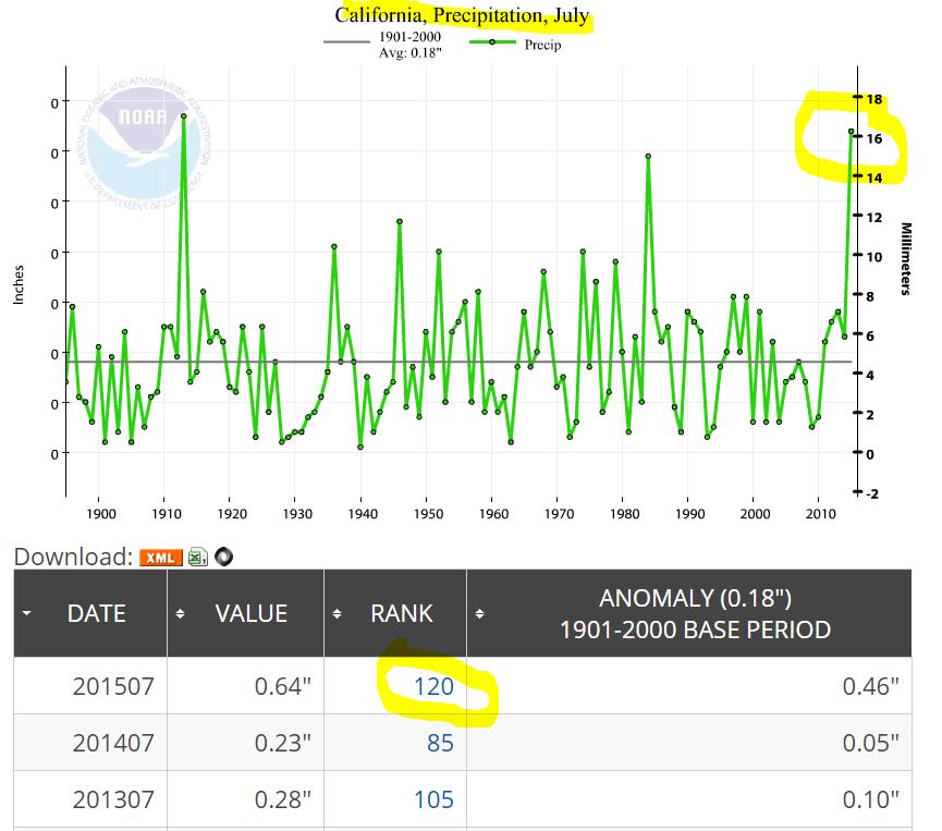 NOAA July 2015 – USA – 2nd Wettest July in California History