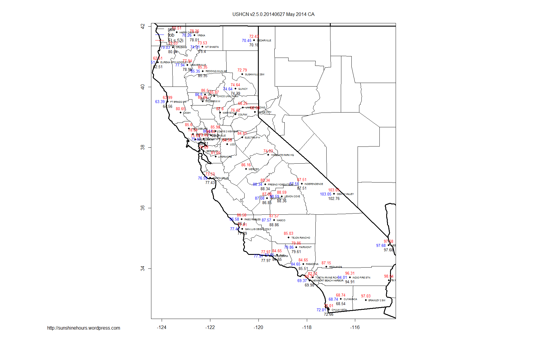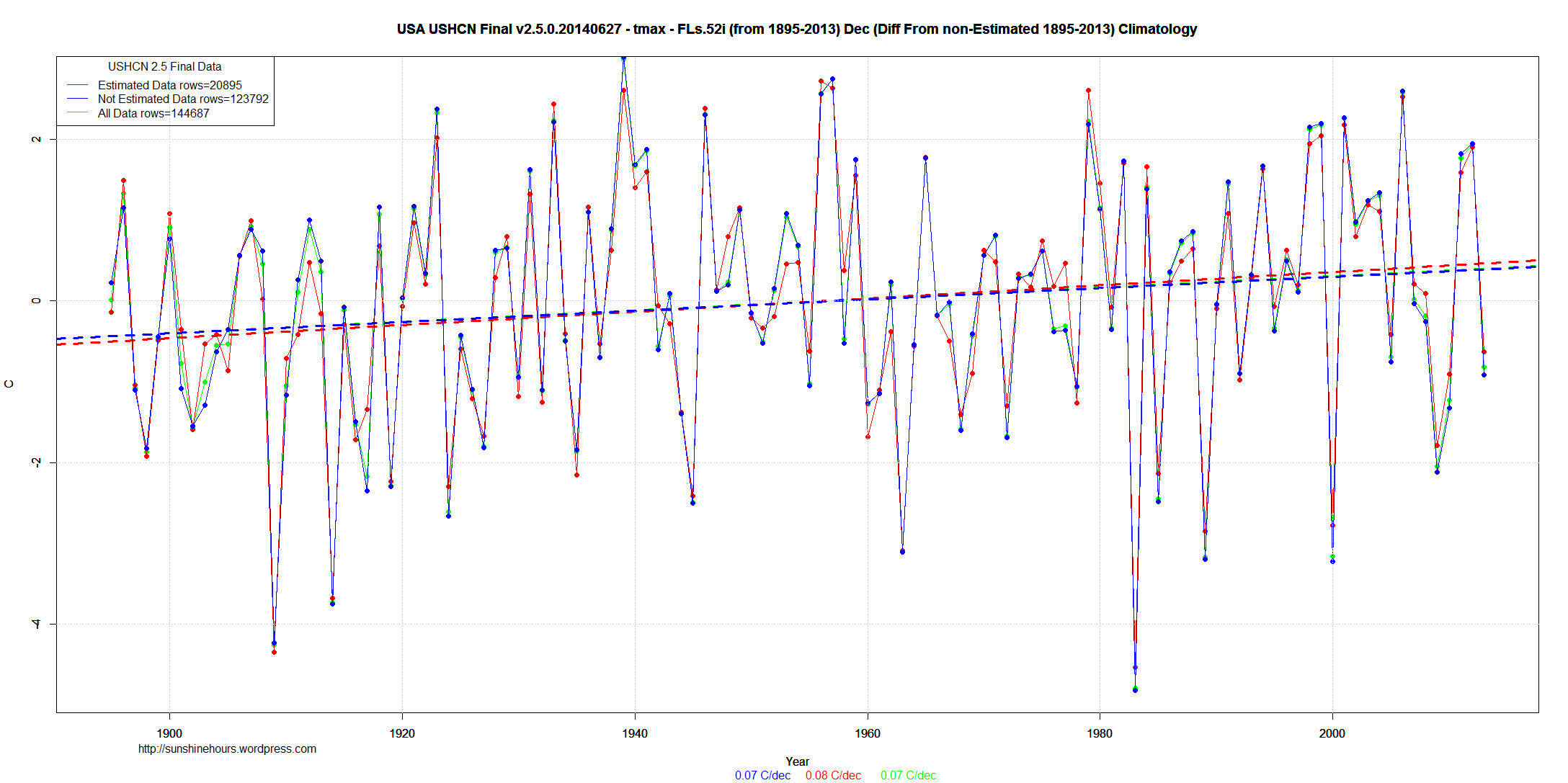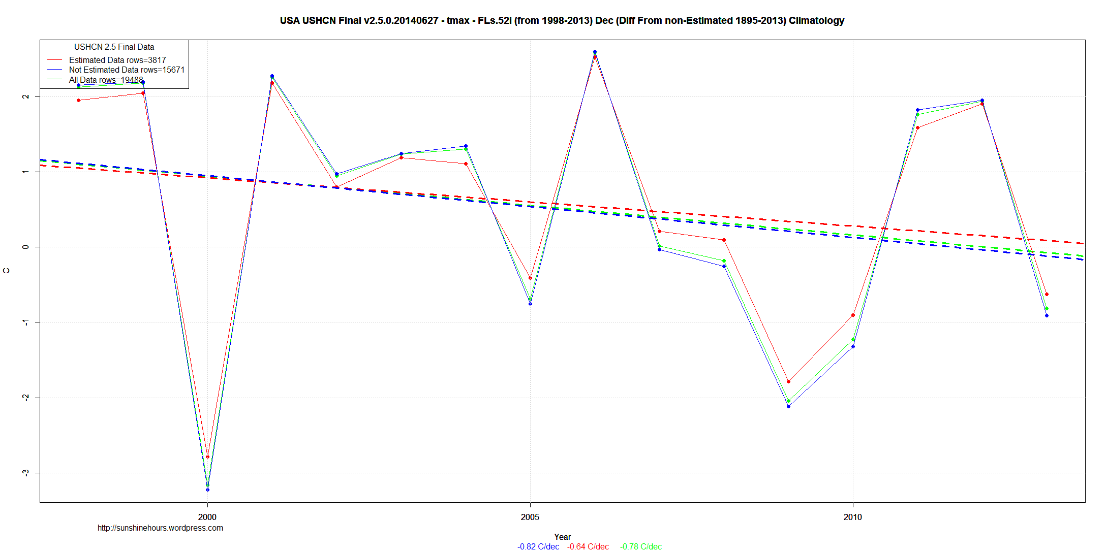 As an example of what infilling does using the difference by station from the 1895-2013 baseline here is Dec 1998 to 2013 Tmax.