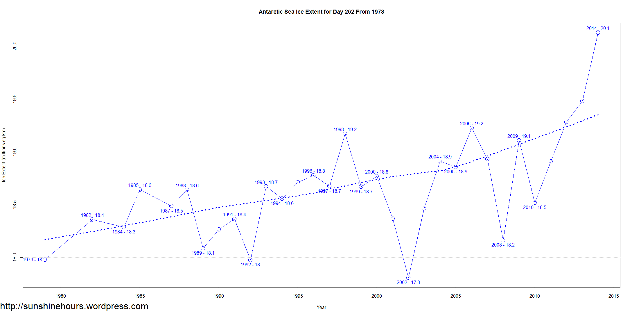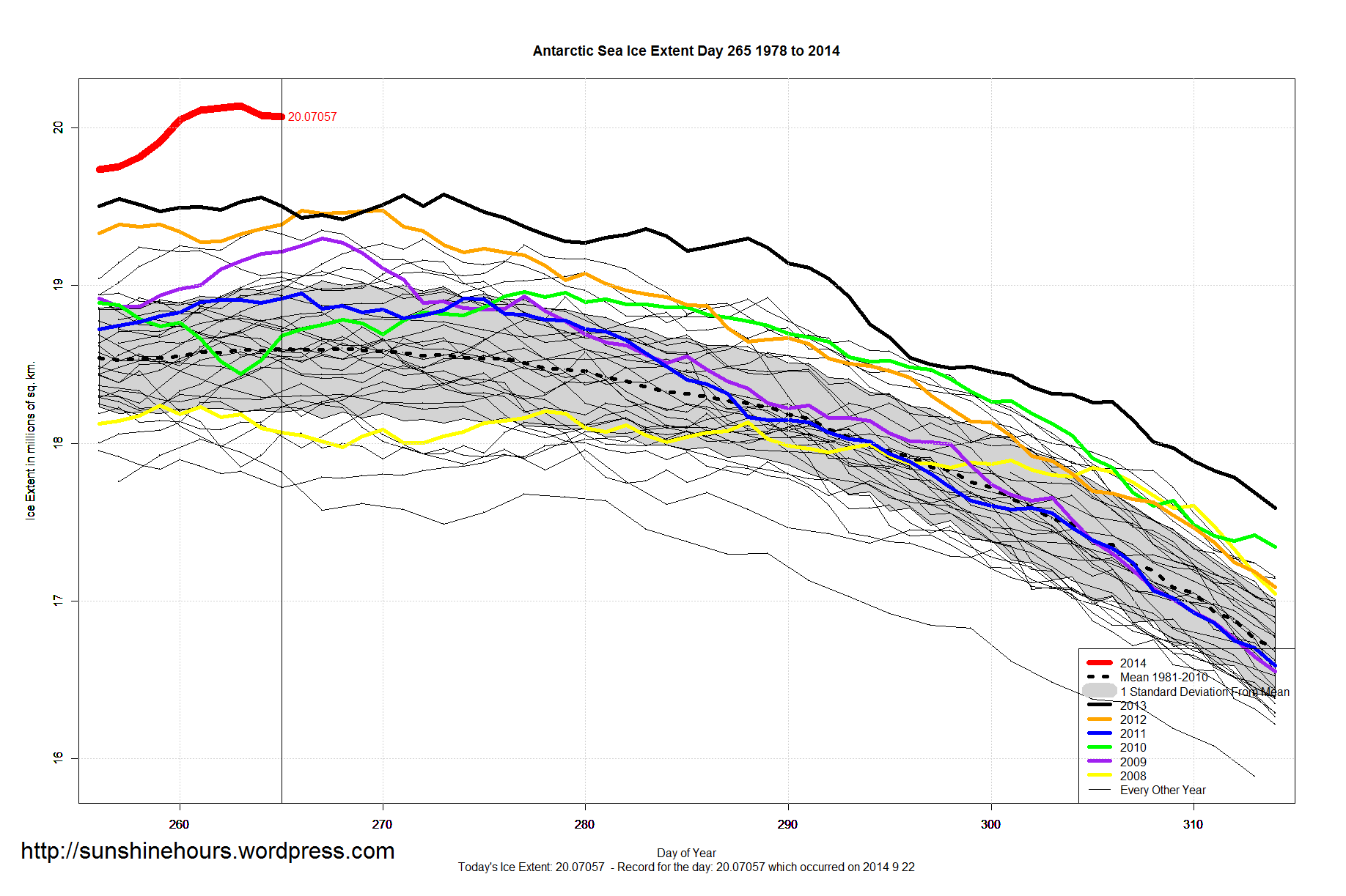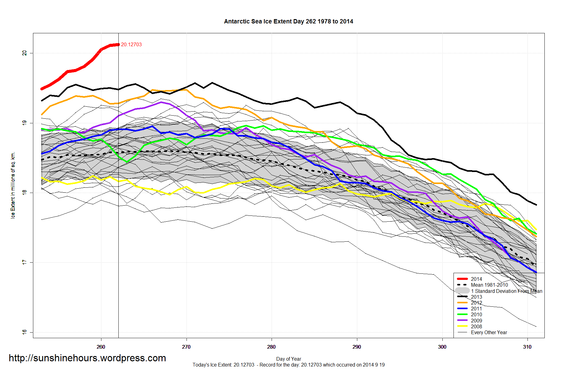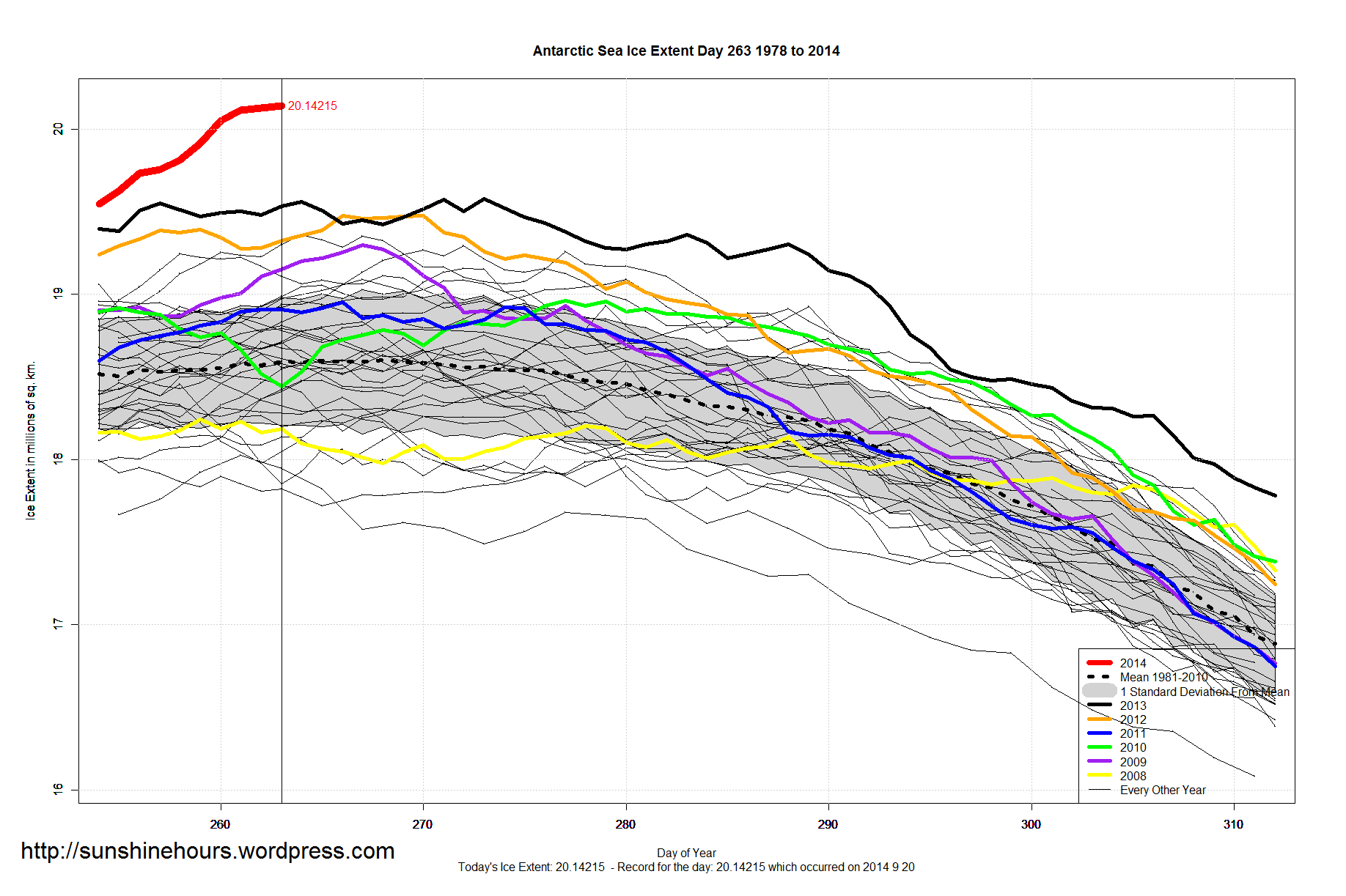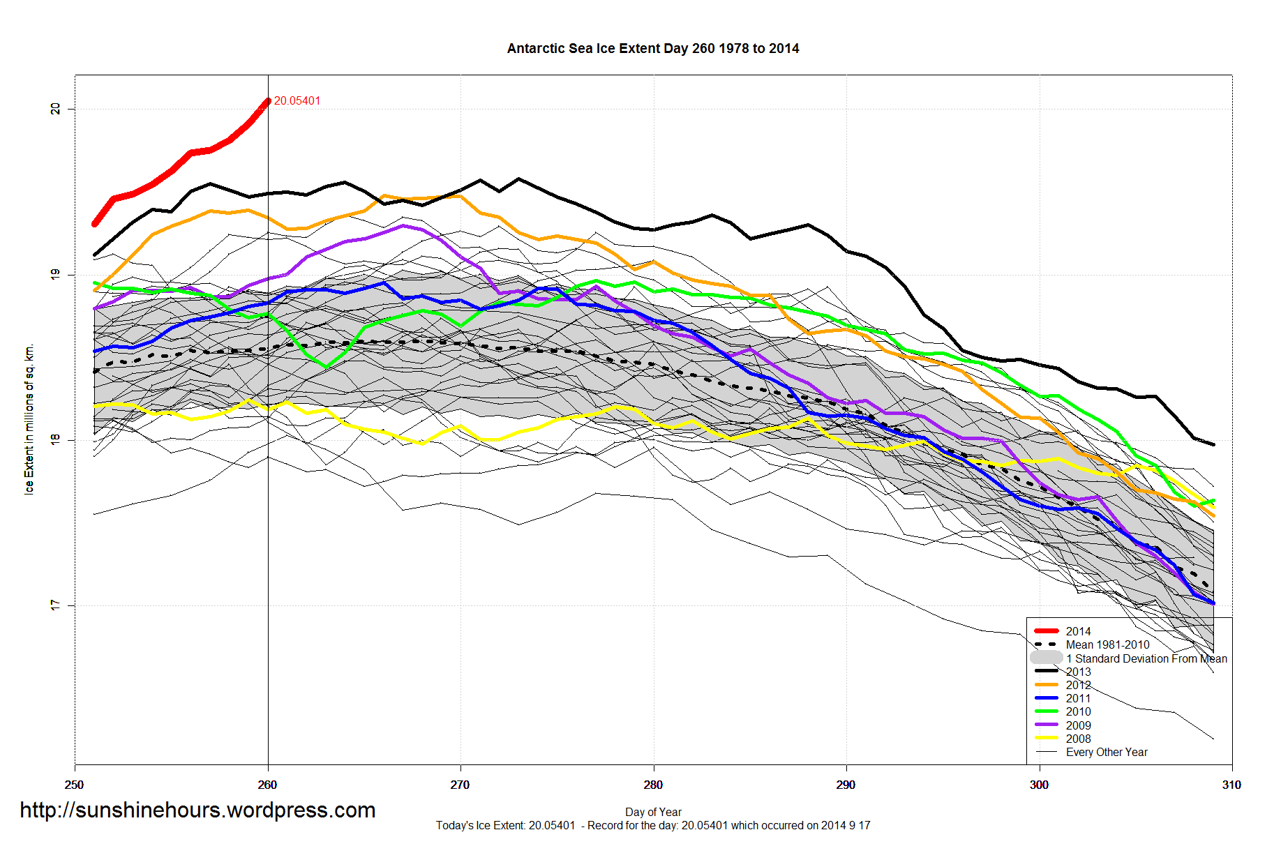 Antarctic Sea Ice Extent Sep 20 2014 – 1,554,000 sq km above the 1981-2010 mean. Data for Day 262. Data here.
