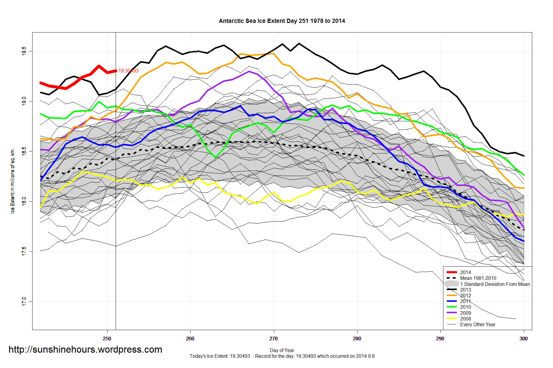 Antarctic Sea Ice Extent Sep 09 2014 – 892,000 sq km above the 1981-2010 mean. Data for Day 251. Data here.