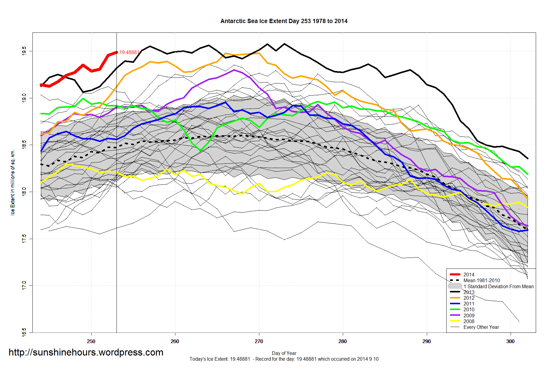Antarctic Sea Ice Extent Sep 11 2014 – 1,017,000 sq km above the 1981-2010 mean. Data for Day 253. Data here.