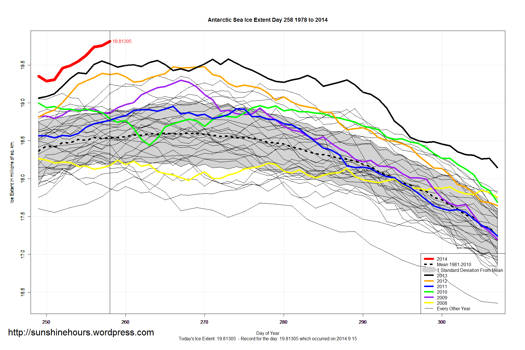 Antarctic Sea Ice Extent Sept 15 2014 – 1,224,000 sq km above the 1981-2010 mean. Data for Day 257. Data here.