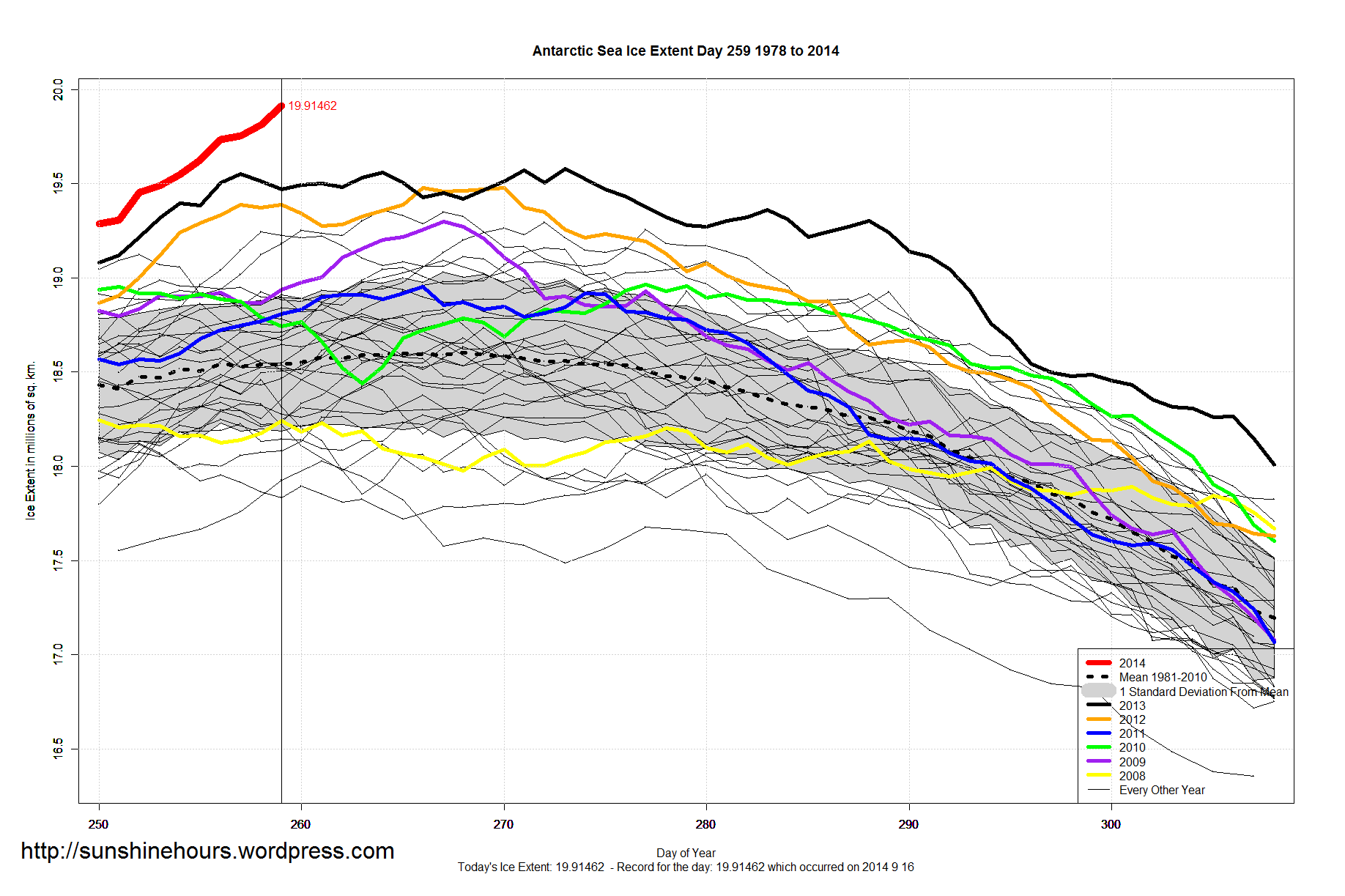 Antarctic Sea Ice Extent Sept 14 2014 – 1,191,000 sq km above the 1981-2010 mean. Data for Day 256. Data here.
