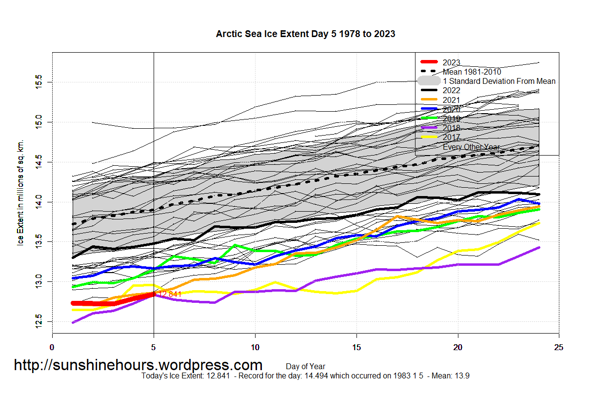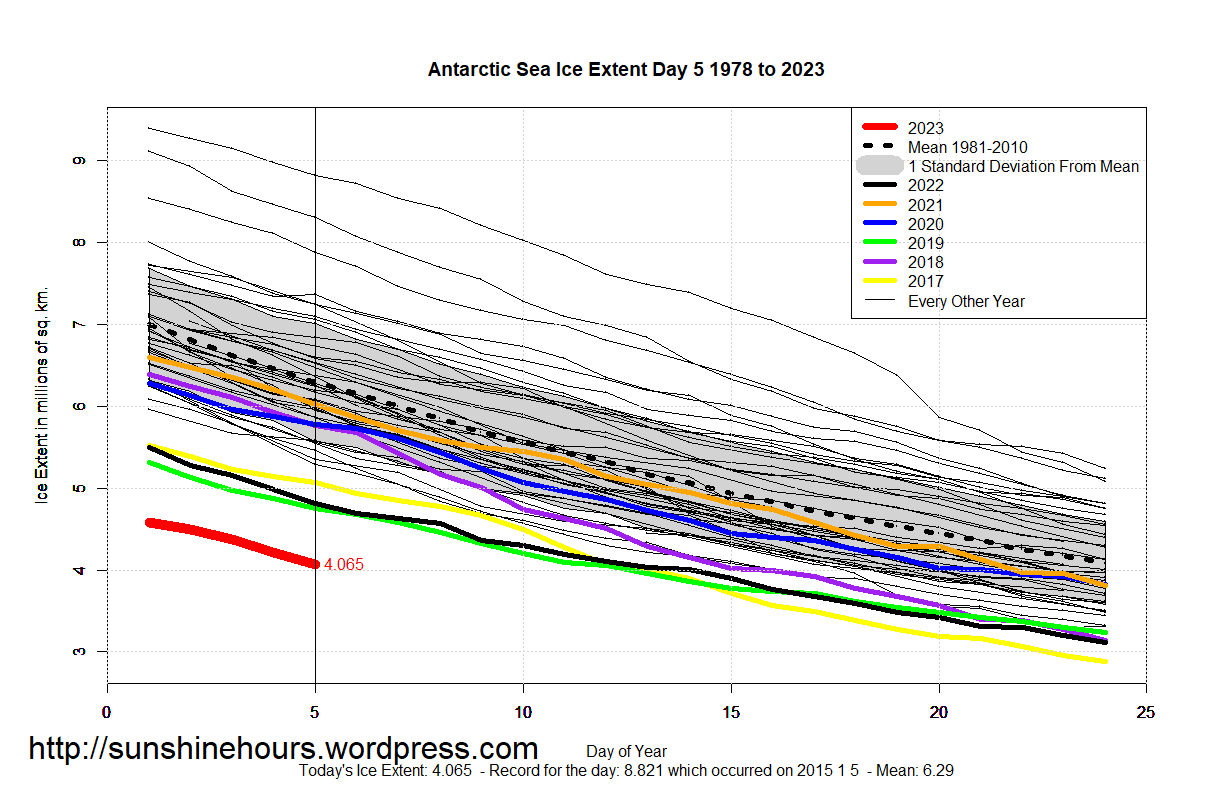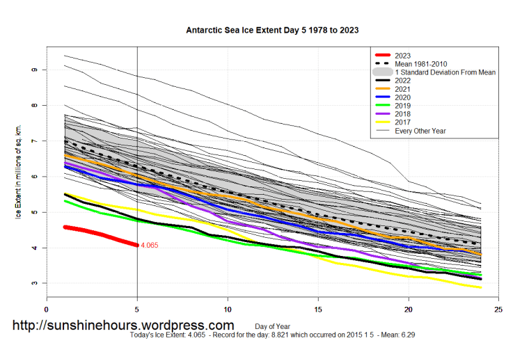 Sea Ice Extent (Global Antarctic and Arctic) – Day 5 – 2023