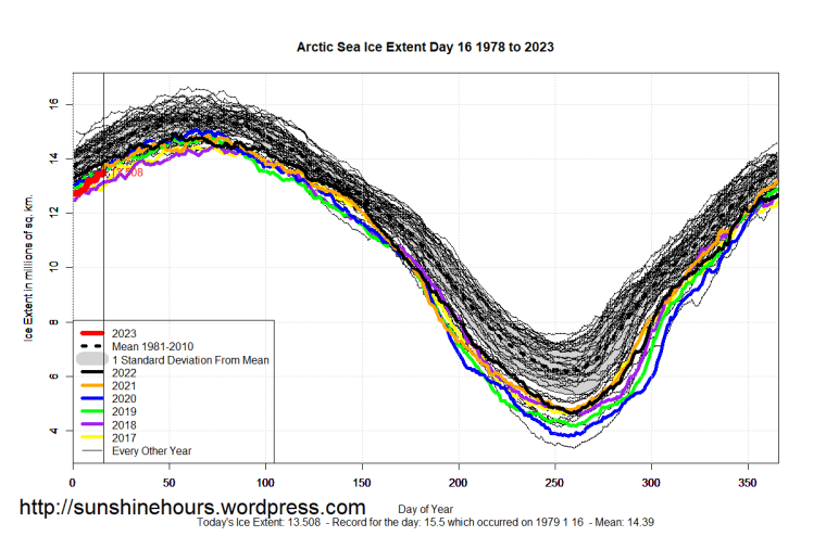 Sea Ice Extent (Global Antarctic and Arctic) – Day 16 – 2023