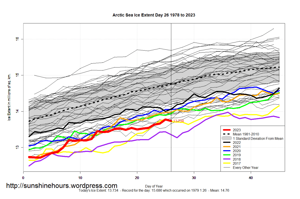 Sea Ice Extent (Global Antarctic and Arctic) – Day 26 – 2023