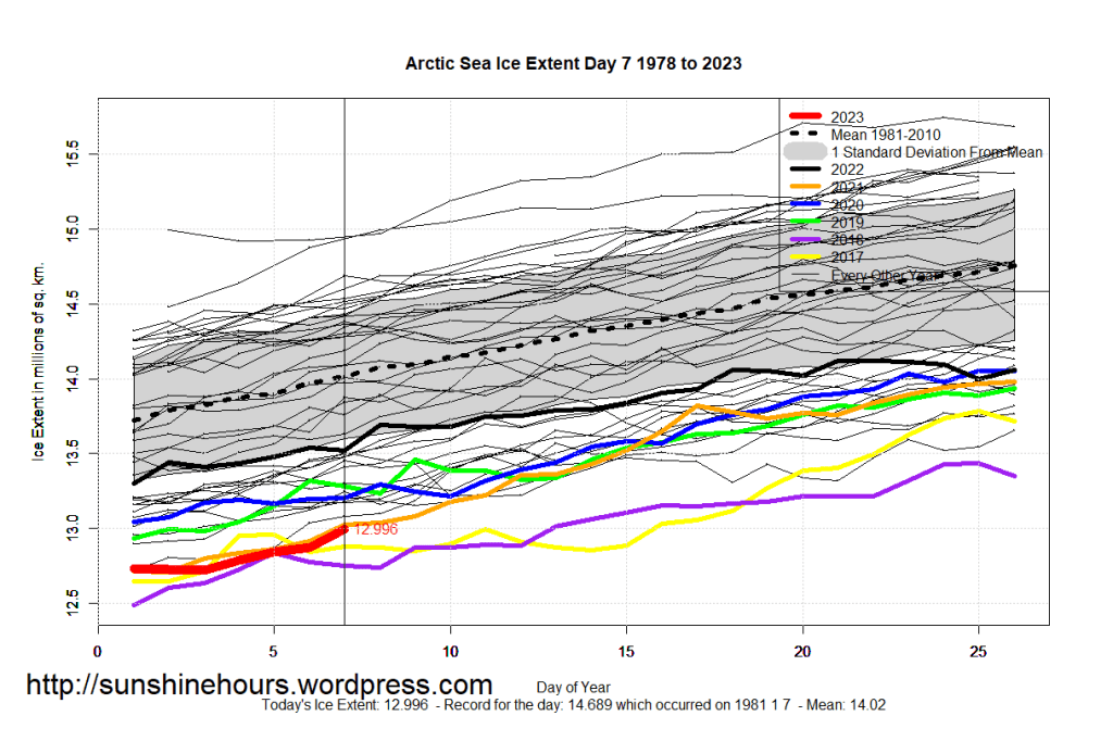 Sea Ice Extent (Global Antarctic and Arctic) – Day 7 – 2023
