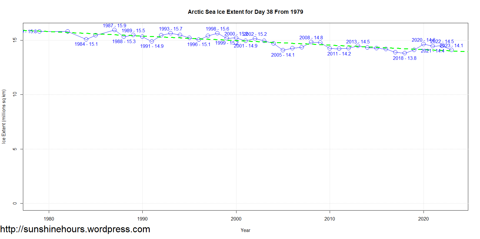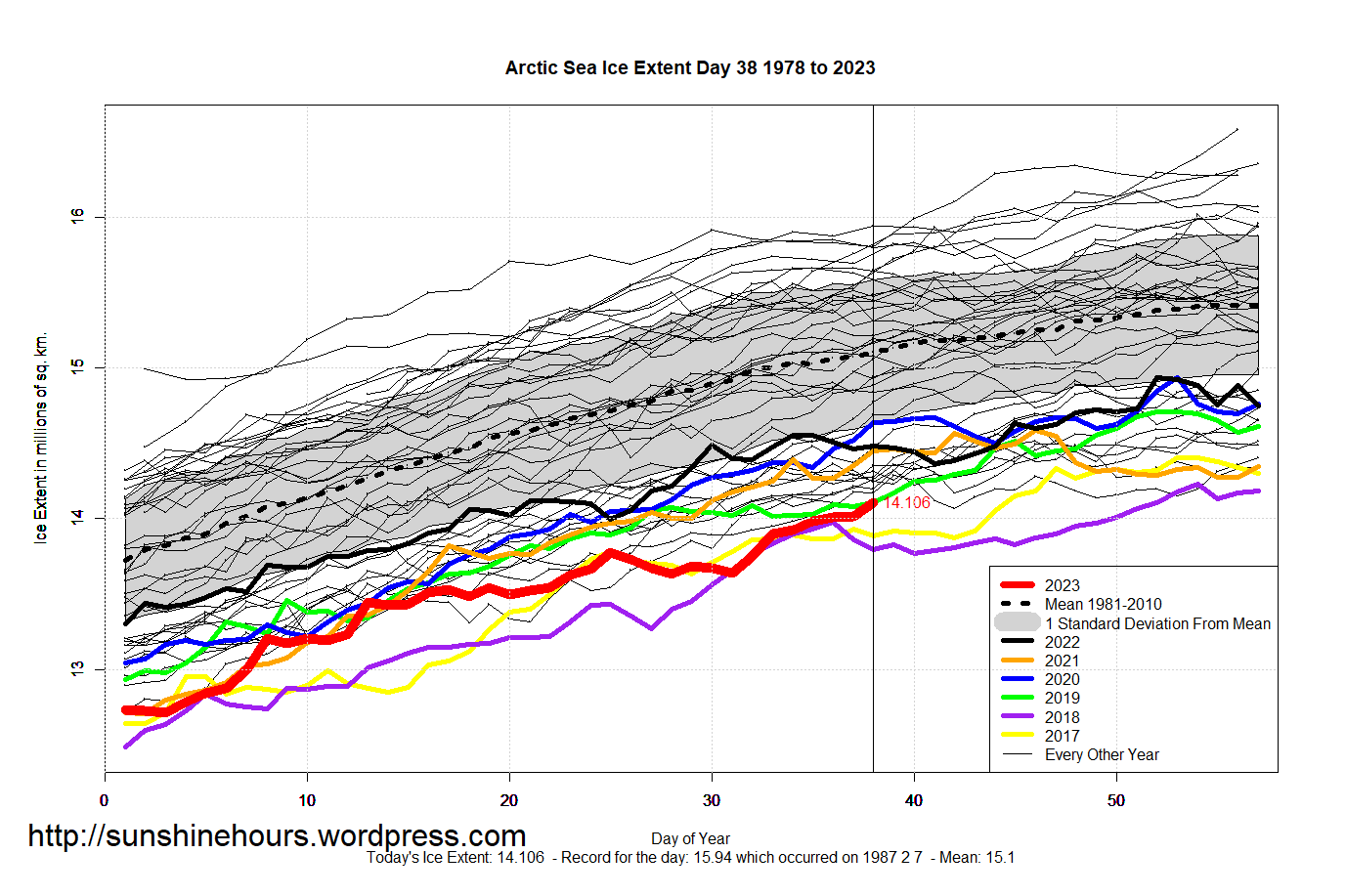 Sea Ice Extent (Global Antarctic and Arctic) – Day 38 – 2023