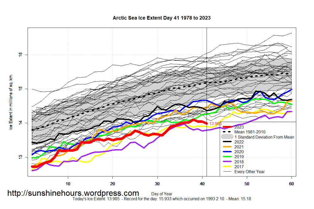 Sea Ice Extent (Global Antarctic and Arctic) – Day 41 – 2023
