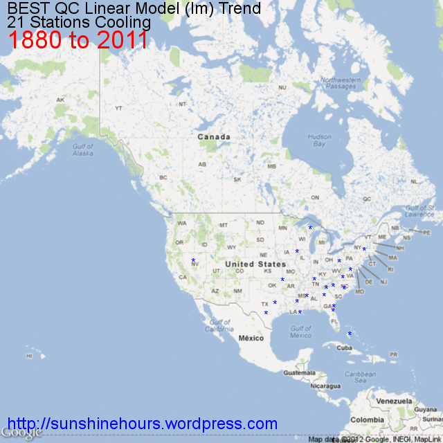 And, just to be fair, Fig. 6 is the same grid square 1945 to 2011. Notice that a few stations are still cooling and the warming trend is only .1C per decade.