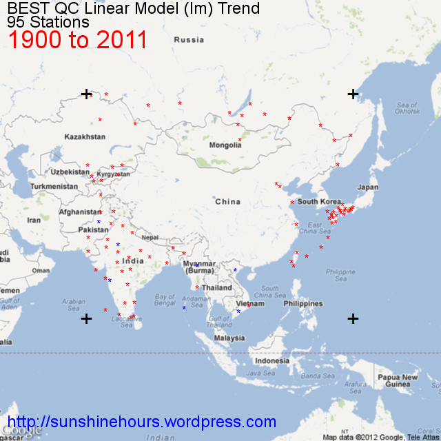 Then the BEST data came out with a new release. I decided to compare BEST with Environment Canada and found some interesting things out. But that’s a different story. I decided to rewrite my [R] script and analyze the Quality Controlled release, and I came up with another idea of “mapping” the stations by color (red for warming and blue for cooling) against latitude and longitude.