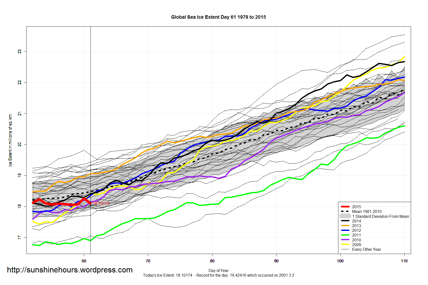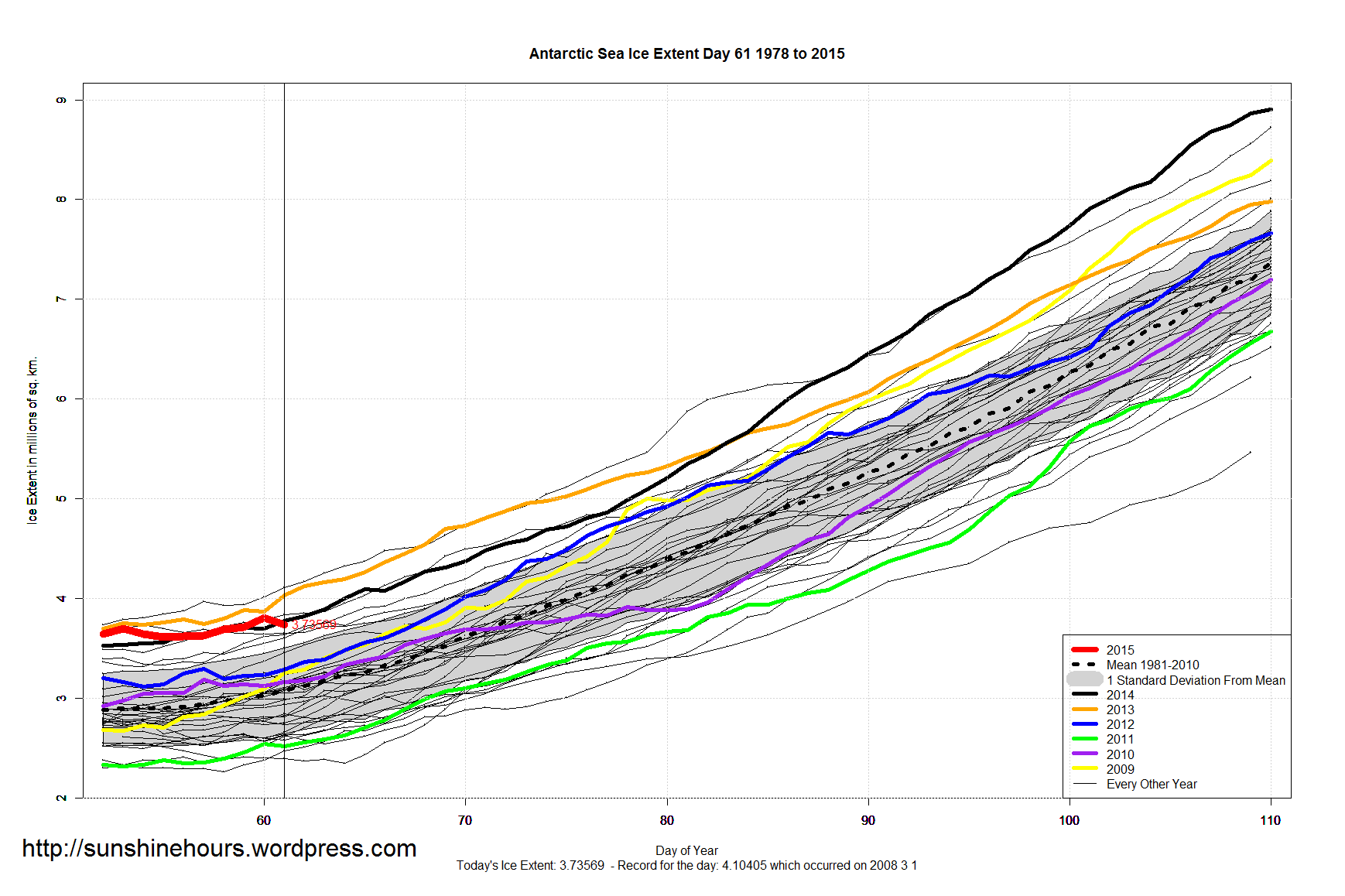 Sea Ice Extent – Day 60 Published on March 2, 2015March 2, 2015 by sunshinehours1Leave a comment Data: South / North