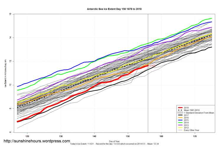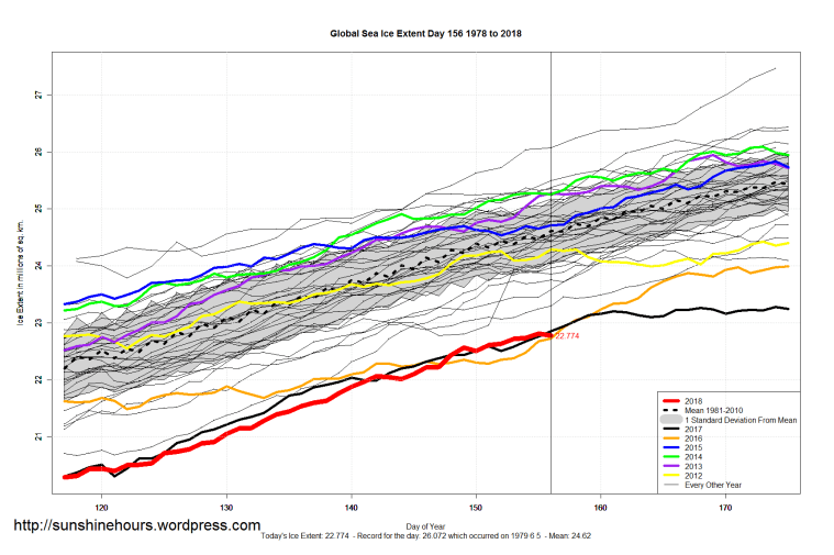 Sea Ice Extent (Global Antarctic and Arctic) – Day 156 – 2018 Published on June 6, 2018June 6, 2018 by sunshinehours11 Comment South / North
