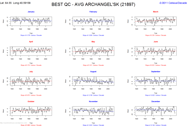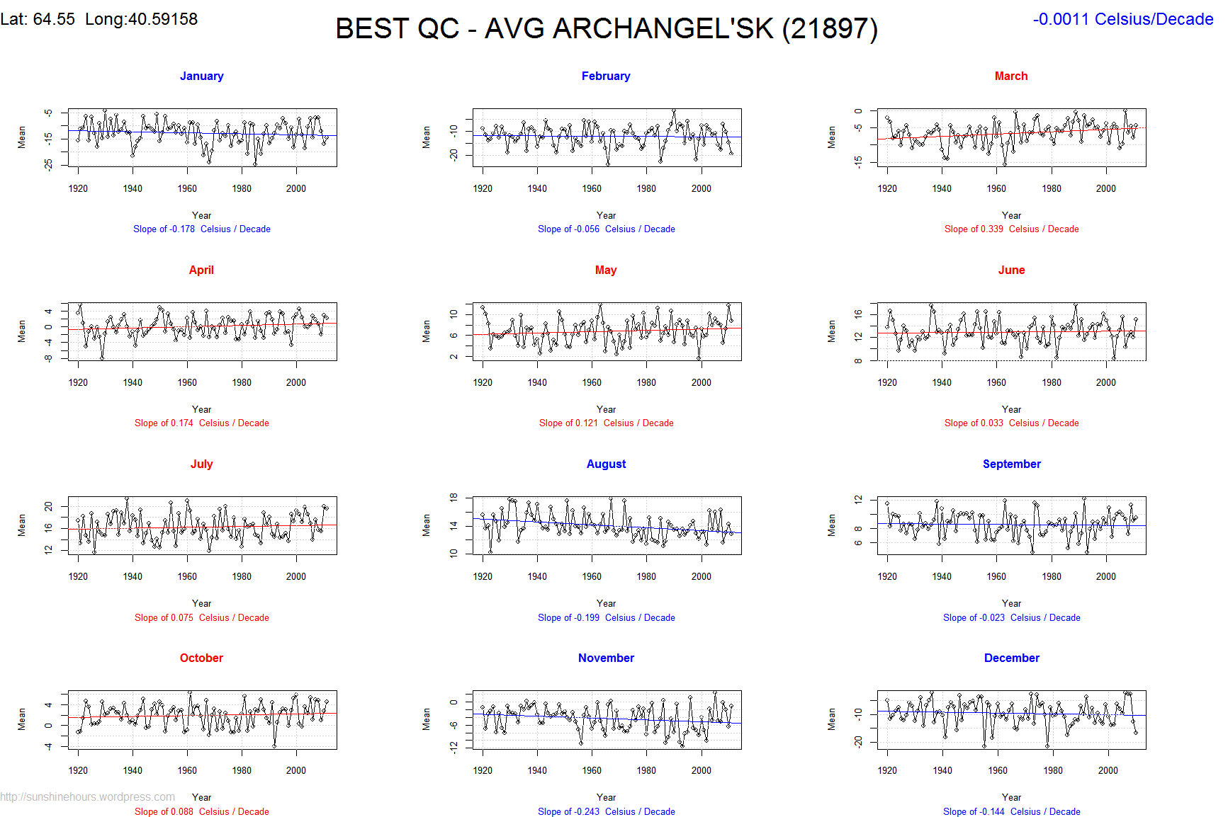 I was reading a post at WUWT concerning GISS adjustments to Arctic stations and I thought I would see what BEST data shows for the main station in question. It shows a very slight cooling since 1920. Six of the months are warming and six are cooling.