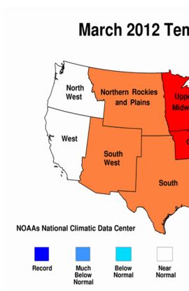 In the West region, March 2012 was 76th warmest. It was 7.6F colder than 1934, again the warmest March.