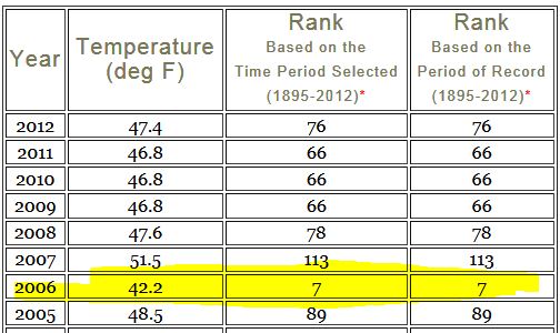 But take a look at 2006. 7th warmest. 111 were warmer. The last 5 years have been quite cold.